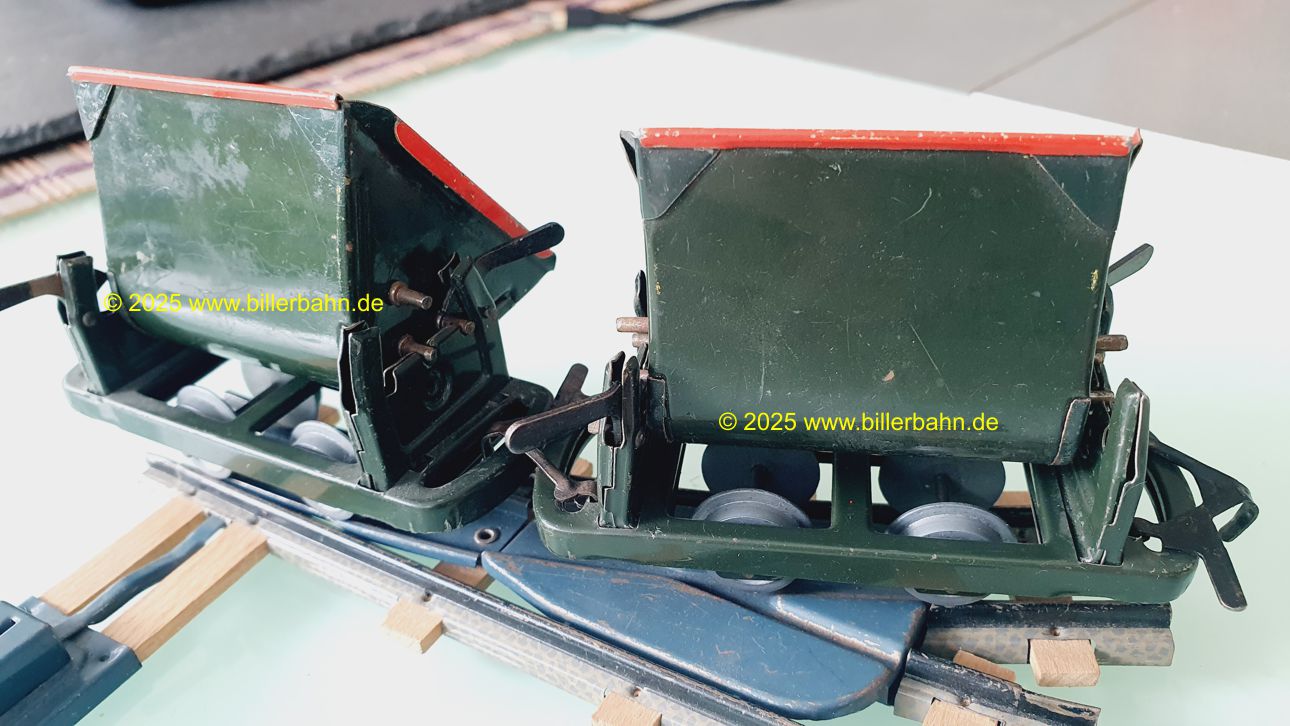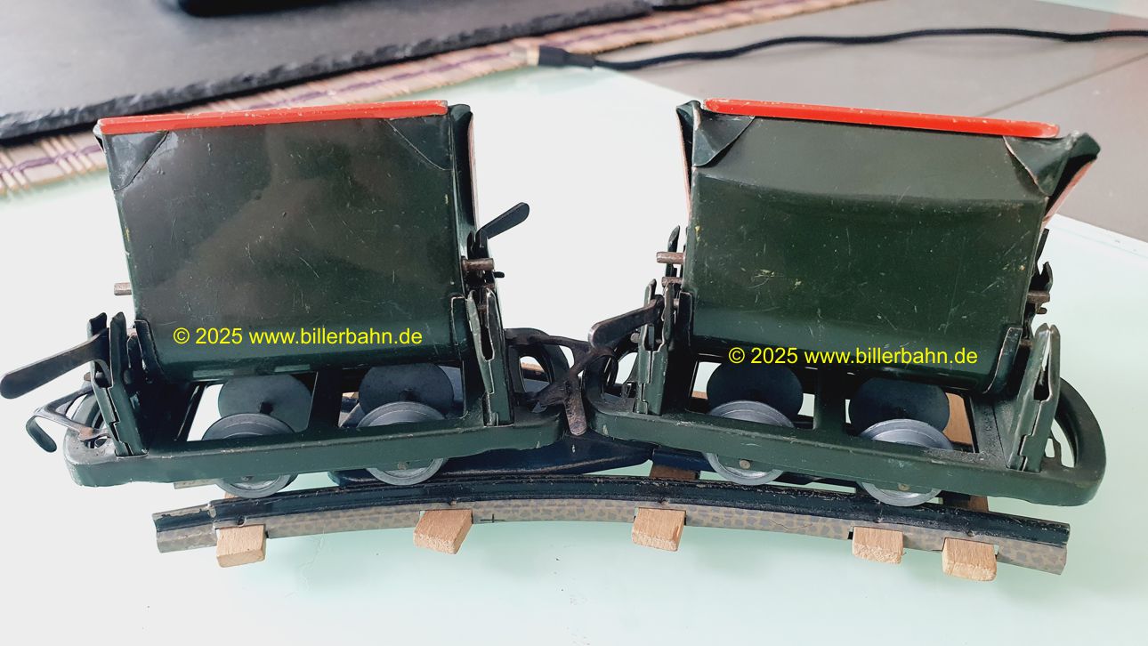 Tipper, numbered from 1 through 9, chassis and tipper light Green, the tipper was removable from the chassis. 3 versions known so far: 1. tipper inside initially Rubin Red (RAL 3003), the holding pins were blackened 2. approx. 1950 and later Fire Red, (RAL 3000), the holding pins were blackened 3. as described at 2. - now the holding pins are metallic blank The tippers were the first models ever issued - and it should last until 1953 before other wagons were emitted. |