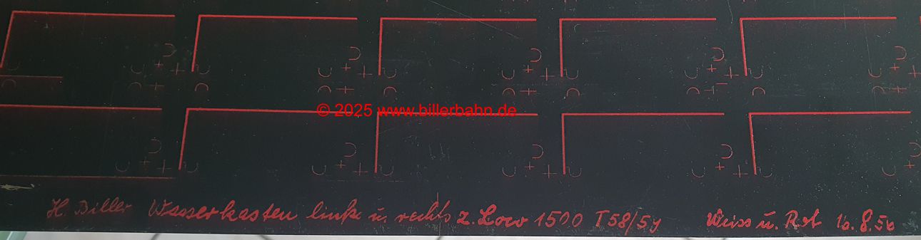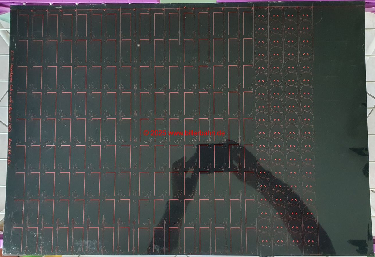 | Unpunched sheet metal for the black 1500 / 1510 - 72 pairs of water boxes with the "semicircles" for the tabs and 72 flat tops for the switch. | Order date 16.8.1958. It's probably a revised version, as the locomotive already existed from 1956! | ||