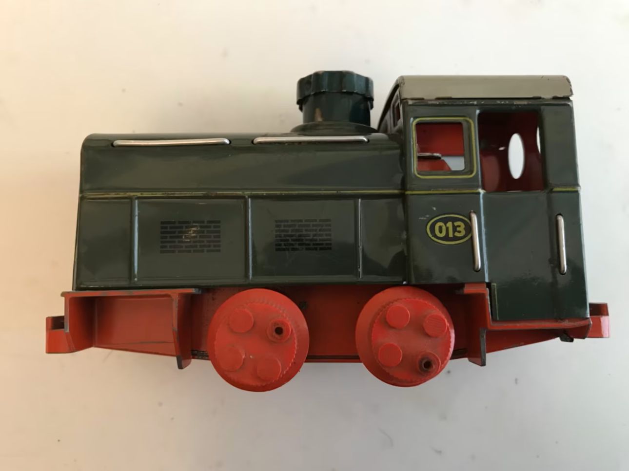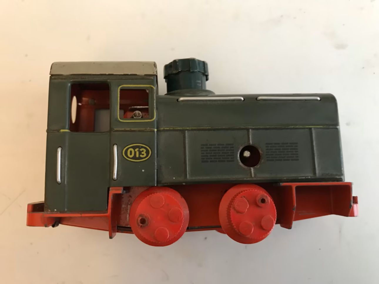 | What a hodgepodge - so many parts of different locos: chassis of a 550/1550, battery truck 1502 of a blue 1500, superstructure of a normal 013 Diesel, Motor of a red 1500. | This one has been on the front page twice - Diesel outline superstructure on a wooden 4-axle truck. |